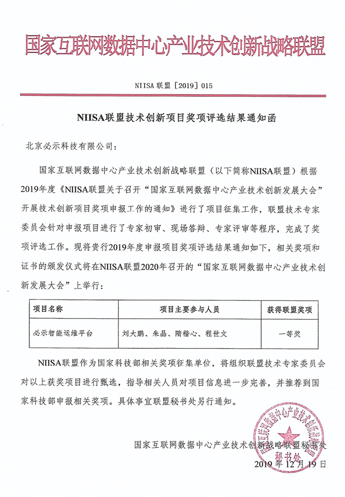 必示科技荣获NIISA联盟2019技术创新项目一等奖