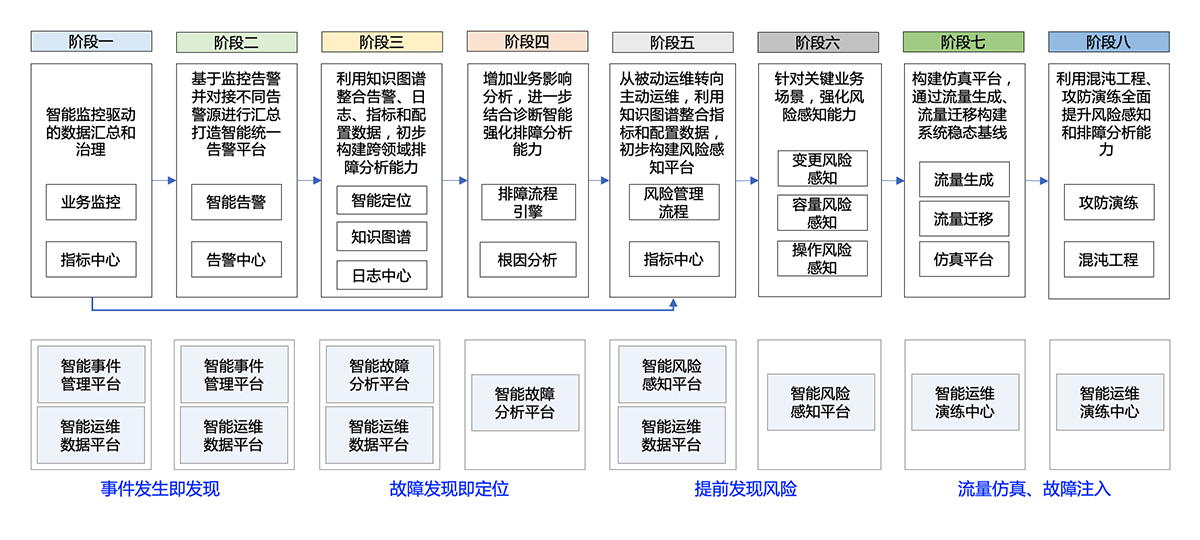 第八阶段:利用混沌工程做全面的风险、故障攻防演练,完善风险感知、智能监控、和排障分析等工具,提升智能化水平,最终构建出高度智能的运维体系。