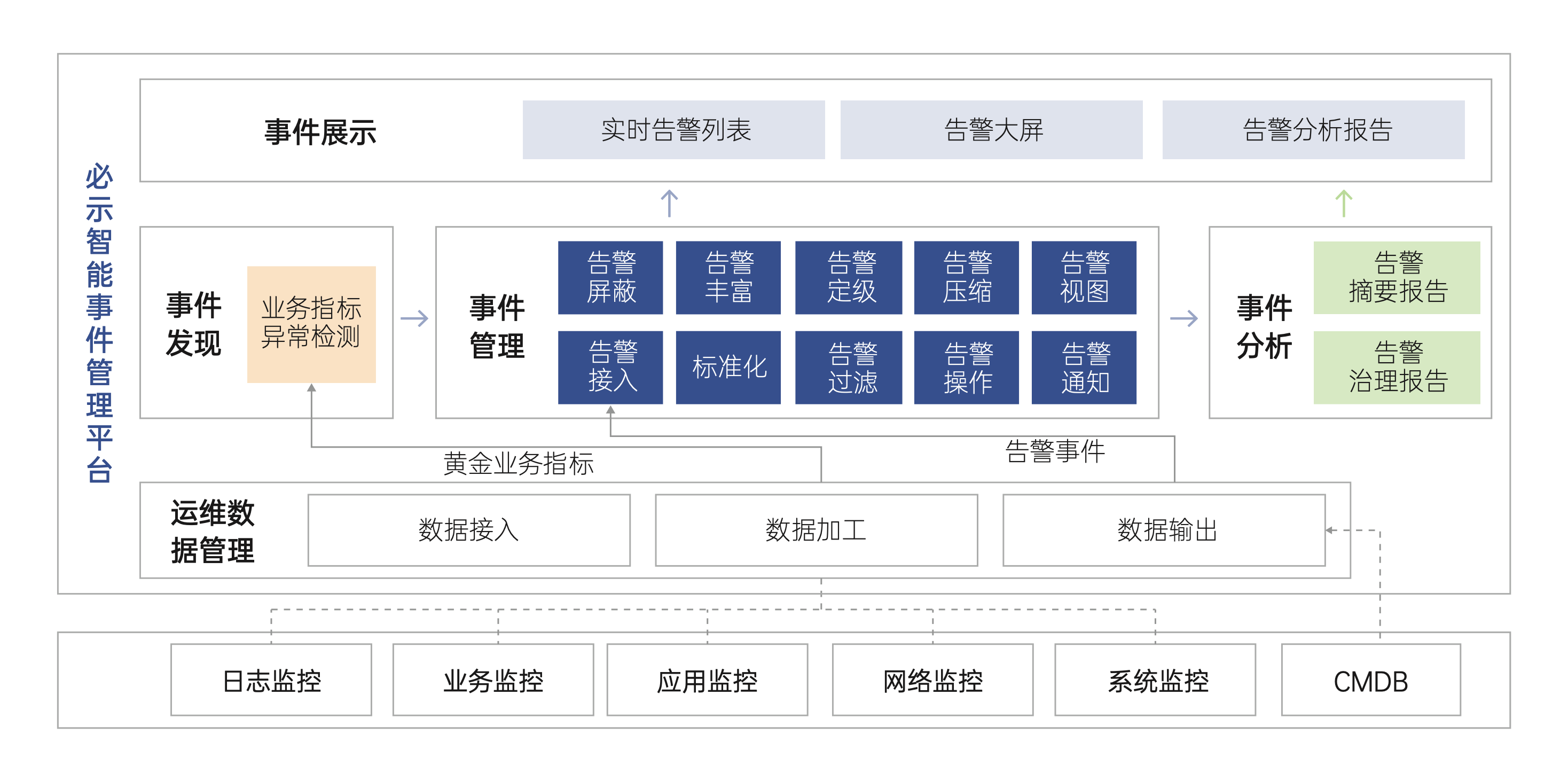 所以,具有全流程的告警数据运营体系、告警发生时迅速甄别显示告警紧急程度、减少无效告警、真实显示准确告警,且具有优化告警规则调整升级能力的告警管理产品被迫切需要---必示智能事件管理平台应运而生。