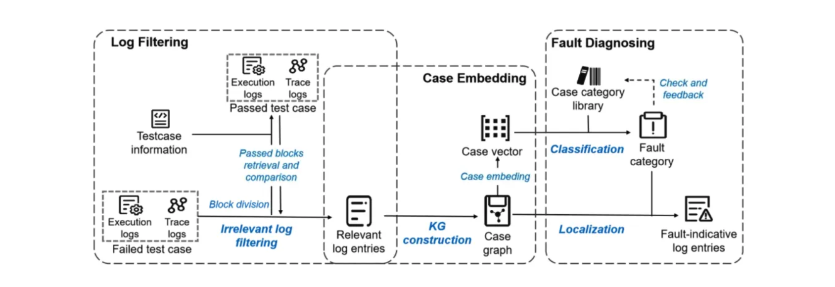SynthoDiag框架包括三个主要组成部分:日志过滤、用例嵌入和故障诊断,如图2所示。在解析失败测试用例的日志时,SynthoDiag首先基于日志块过滤掉与测试失败无关的日志内容(解决挑战2)。然后,基于过滤后与测试失败相关的日志内容构建失败测试用例的知识图谱,有效整合不同来源的日志内容(解决挑战1)。接下来,SynthoDiag利用语义信息通过知识图嵌入技术将每个失败的测试用例嵌入到一个向量中,并将历史失败的测试用例的向量和标签将存储在用例分类库中。当需要诊断新的失败测试用例时,SynthoDiag使用相同的步骤获取该测试用例的用例向量和知识图谱,然后输出故障类别并定位测试用例中指示故障的日志内容(解决挑战3)。