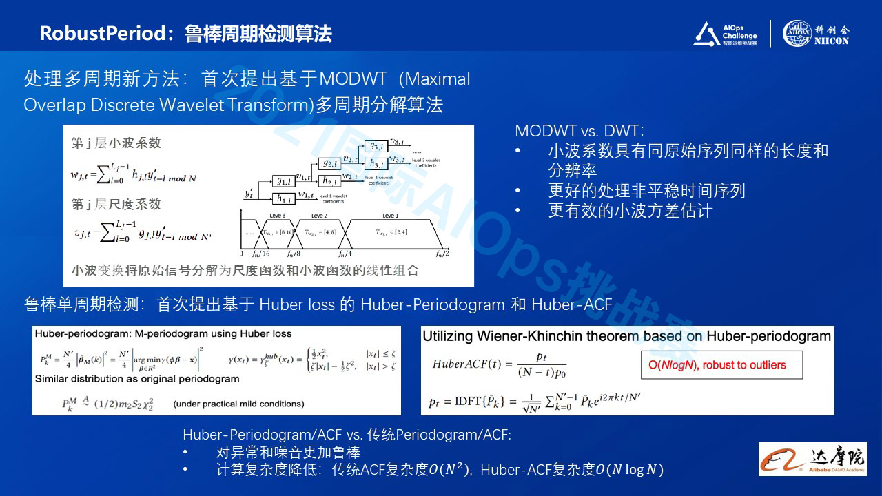 接下来,我们研发了“去多周期之间影响:MODWT 小波,小波能量排序 ”的相关算法,把多周期的问题变成单周期的检测问题。最后一步,又开发了“鲁棒单周期检测:设计 Huber-Periodogram/ACF ”,对这种周期进行更准确的检测。