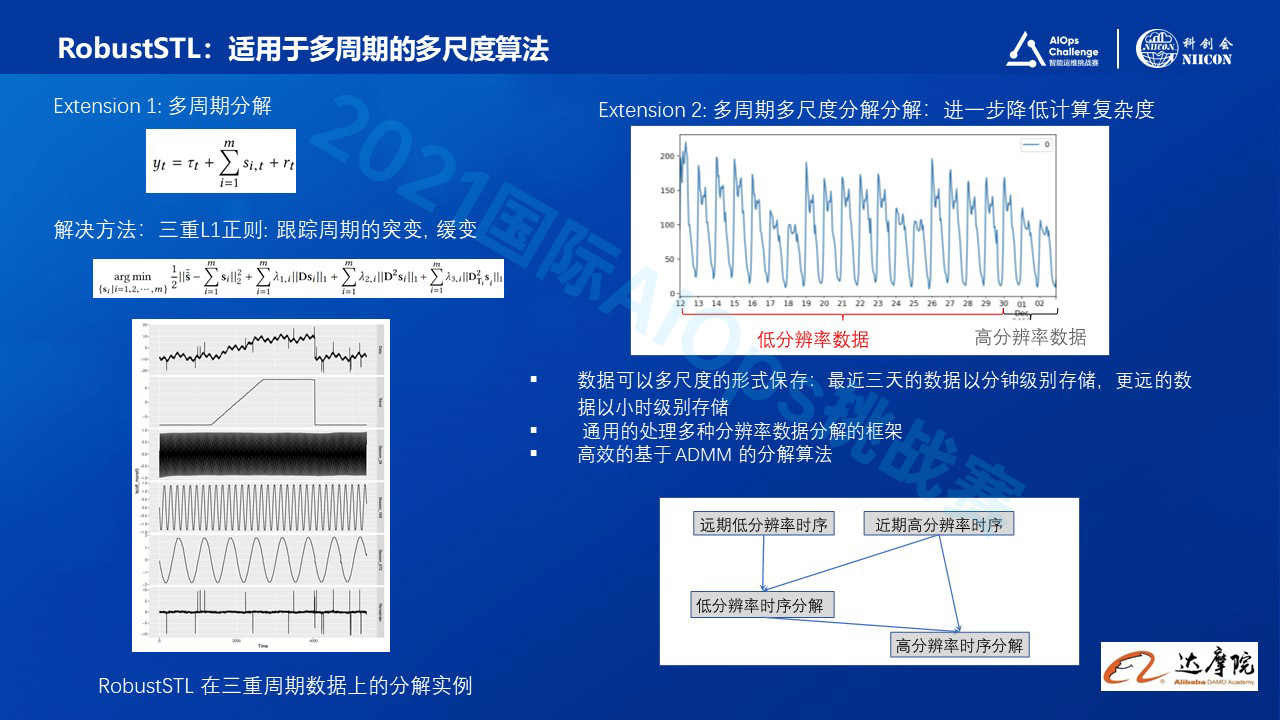 然后基于这个基础的RobustSTL,做了各种各样的算法扩展。比如说为了解决多周期的问题,把信号拆解成趋势信号,多周期累加的信号以及噪音信号。并且开发了这种三重L1正则建模分解多周期数据,可以跟踪多周期信号中的突变和缓变的现象。