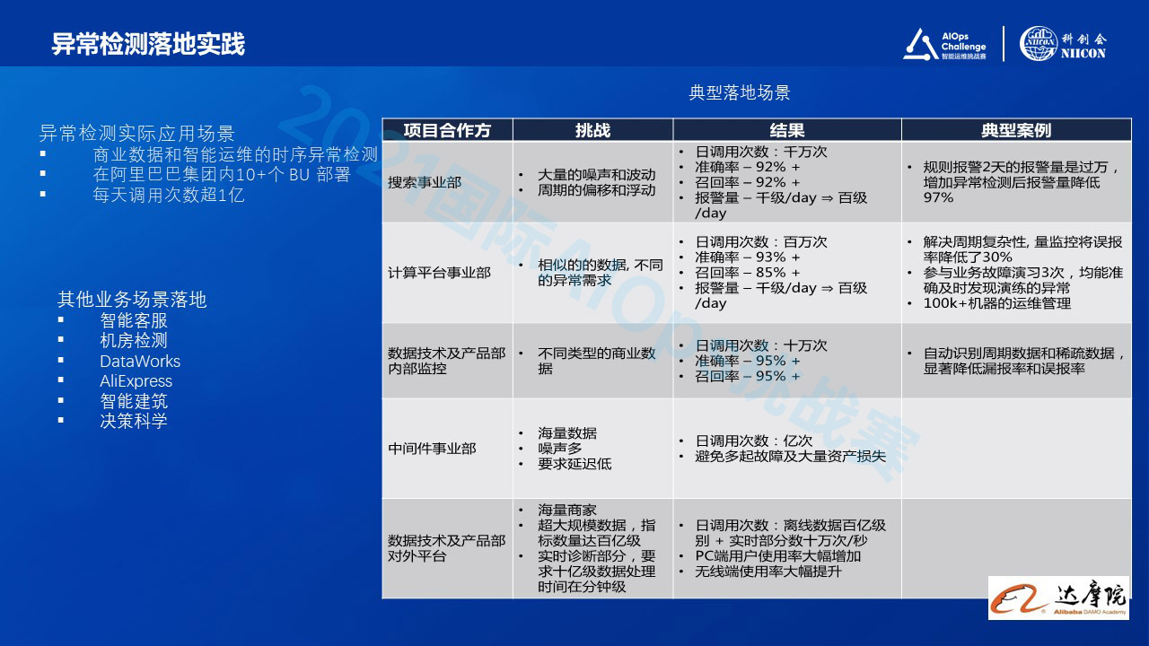 在对这个算法做一个非常快的介绍之后,看一下异常检测序列的落地的情况。事实上,阿里巴巴内部的多个部门都做了成功的部署和上线,集中在搜索事业部和计算平台事业部做的部署,它们做的是典型的智能运维场景。
