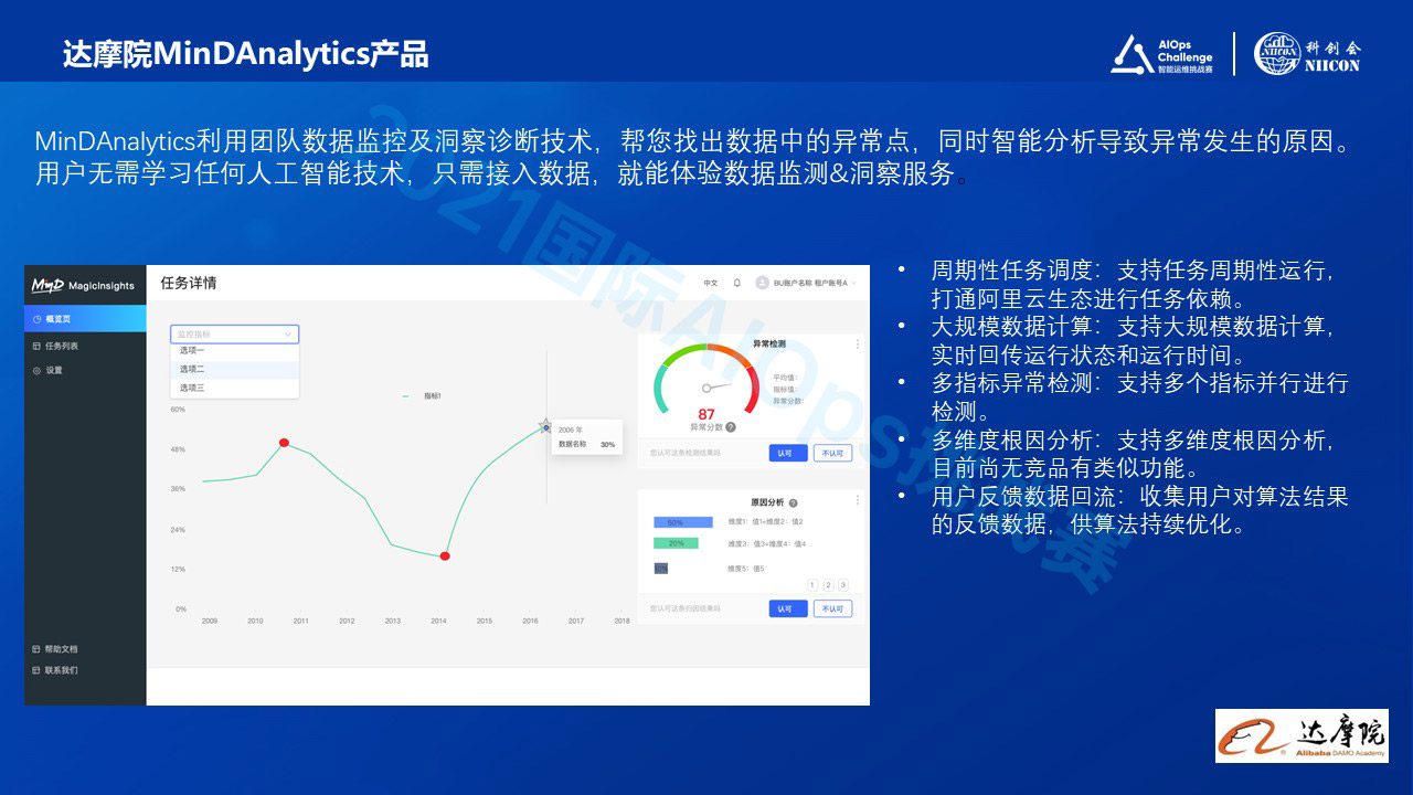 这个是达摩院开发的MinDAnalytics产品,也就是这个产品就是能够集成了我上述的这些时序分析,下传诊断以及因果部分的一个能力。这个产品它能够无虚拟进行任何的这种没有任何的这种领域的知识,只需要输入用户数据,就能够享受到自动化的监测跟洞察的服务。