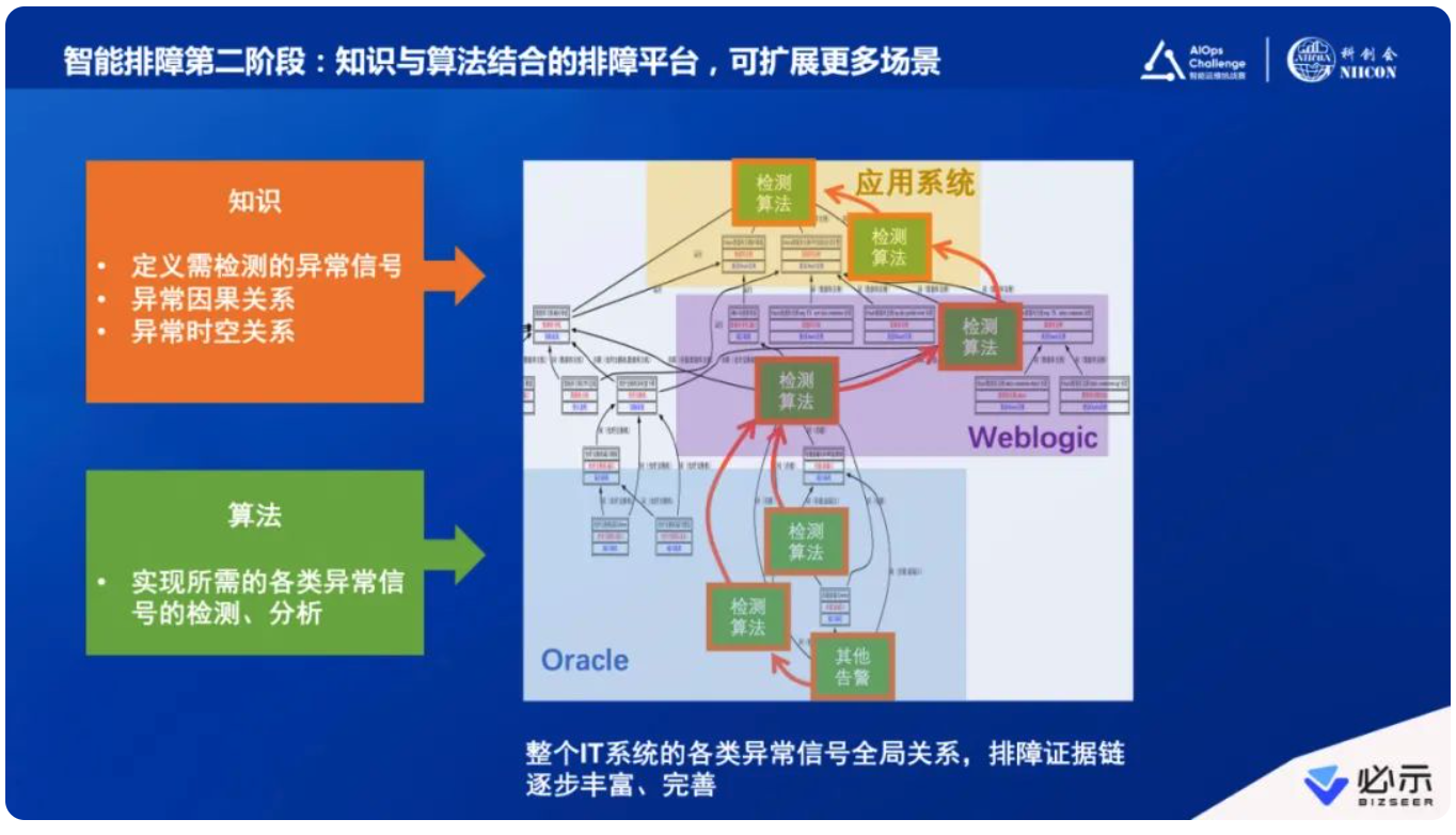 为了解决问题,最重要是把知识纳入进来。比如,在2021国际AIOps挑战赛比赛过程中,选手需要用一些指标和日志去做故障定位。比赛中没有给出SQL层面的详细数据,如果给你的话你会怎么做?你再去做一个算法对数据库层面做检测,检测后的结果如何跟之前的东西链接起来?将来再把存储或者底层网络的数据给你,怎么把做的这么多算法有机地组合起来,然后在上面做定位?这里,知识就变得不可或缺,需要把它纳入到整个系统建设,也许是一个步骤,也许是一个核心构成。