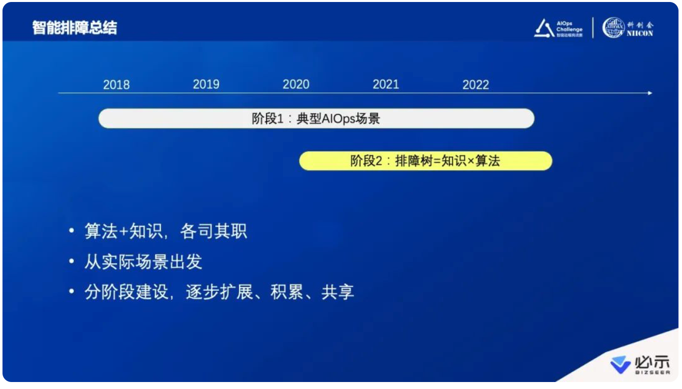 最后总结一下。第一点想说,必示科技团队从2017年开始做智能运维实践落地,经过一段时间的探索逐渐进入到刚才提到的第一阶段,我们找到了运维中一些很典型的、数据普遍具备的场景,围绕这些场景做了很多算法,然后深耕、做穿、打透。我们逐渐发现运维细分场景越来越多,开始进入到第二阶段后,我们愈发认识到算法跟知识同等重要,运维专家对运维场景的梳理和拆解非常关键,在构建整个智能运维架构后才有算法发挥的空间。